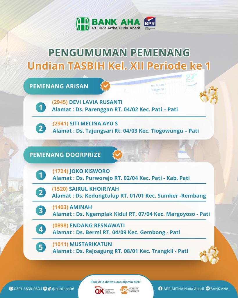 Berikut kami umumkan pemenang undian tasbih kelompok XII peri...